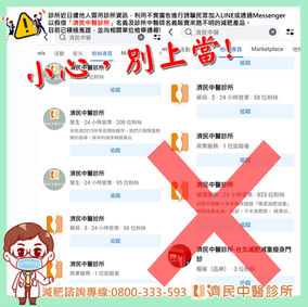 這些假冒帳號疑似設立在境外大陸,為了規避衛生單位查緝,並冒用「台灣濟民中醫診所的名義及網站內容」欺騙消費者行銷產品,濟民中醫在近年來已轉獲不少受騙民眾來電或透過Line反應及求證,上當受騙的民眾都還誤以為是本所(濟民中醫)販售給他們的產品,表示及投訴:吃了該產品之後,一點效果都沒有,且出現腹瀉和其他副作用,並控訴本所賣該產品太貴又沒效欲要求本所應退錢給他們,本所不僅被冒用還得承受這般無妄之災,經過耐心詳細解說之後,民眾才恍然大悟「驚覺自己以上當受騙了!」,藉此特別呼籲民眾,應特別留意該「假冒合法診所名義」作為欺騙民眾行銷產品的騙術,請民眾別再上當,亦可將內容分享給周遭親朋好友,以正視聽方能防止民眾在受騙和以免傷身!